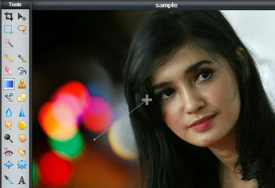 Tahap ketiga. Gunakan "gradient tool" untuk memunculkan efek blur pada foto, pilih gradient color warna putih transparat dengan type "radial". (lakukan dengan hati-hati saat masking). Dan jika sudah selesai jangan lupa gabungan layer "apply layer mask" - "Flatten image".